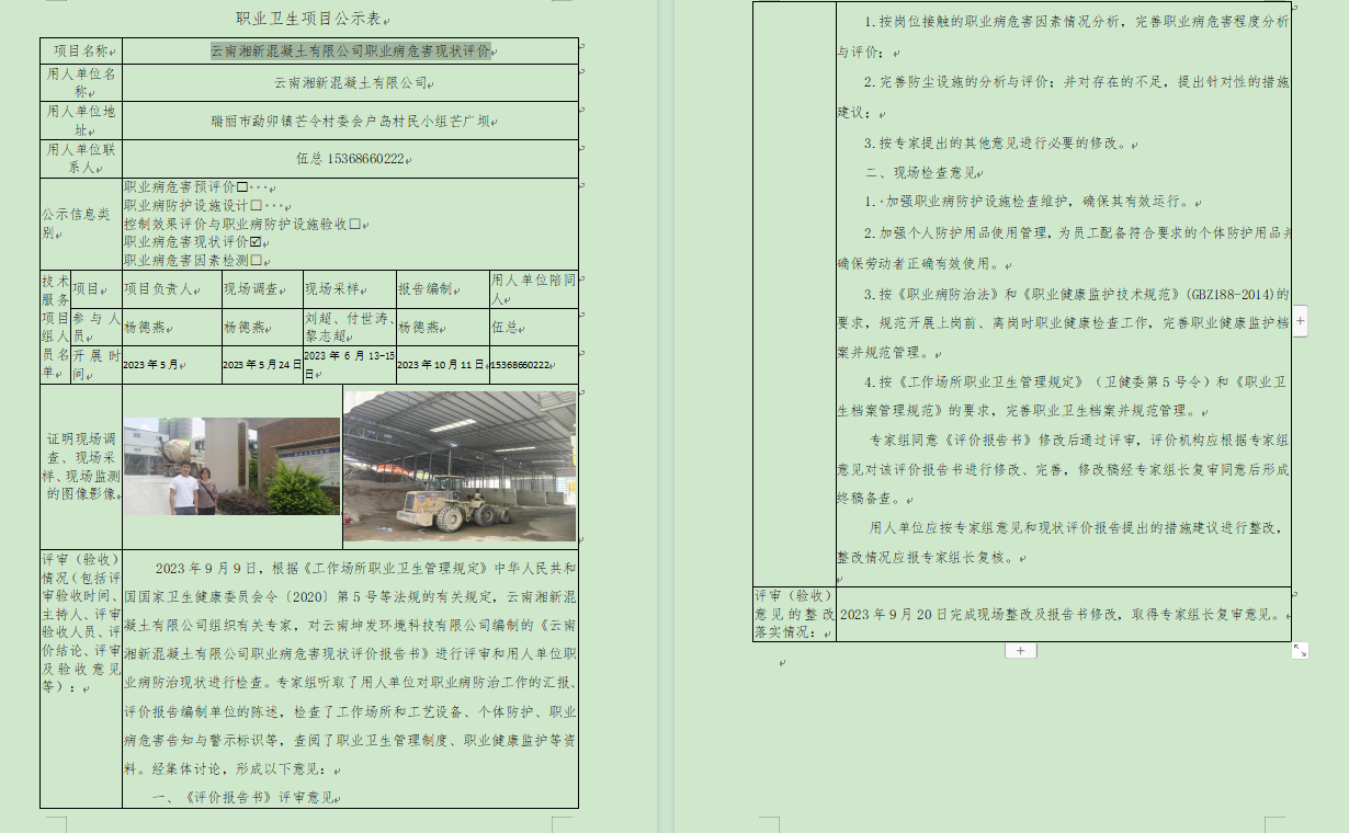 云南湘新混凝土有限公司职业病危害现状评价-尊龙登录