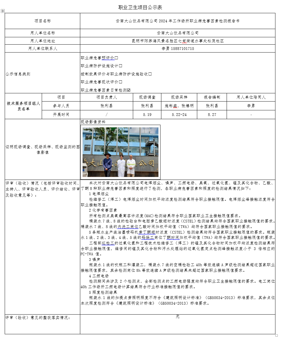云南大山饮品有限公司2024年工作场所职业病危害因素检测报告书