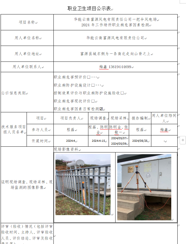 华能云南富源风电有限责任公司一把伞风电场 2024年工作场所职业病危害因素检测