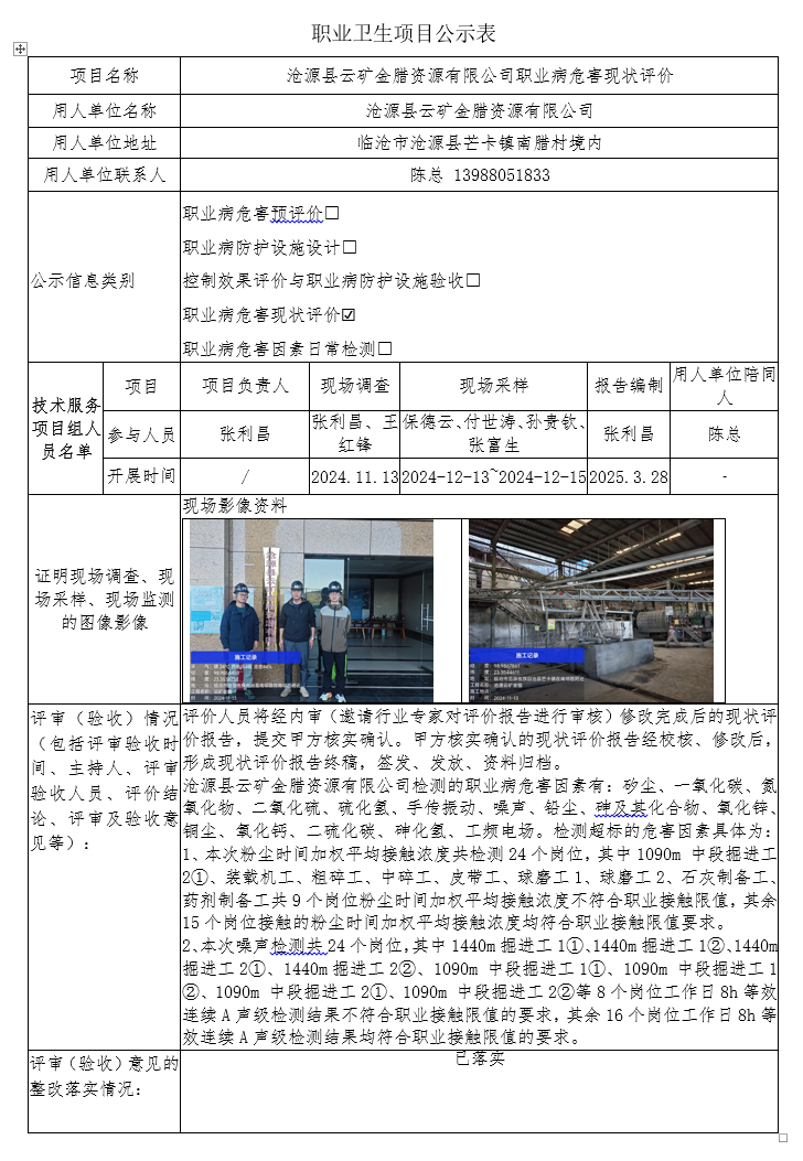 沧源县云矿金腊资源有限公司职业病危害现状评价