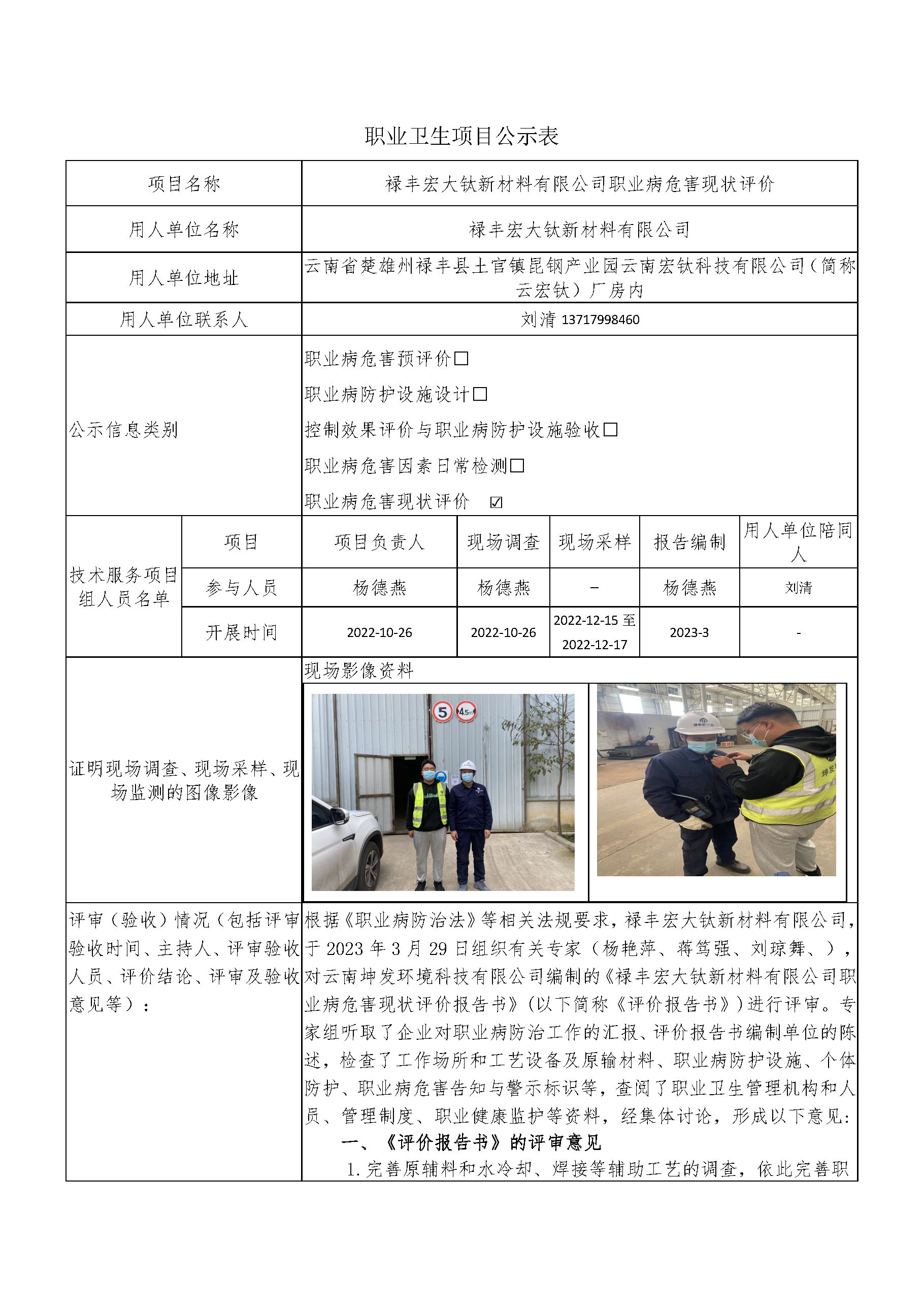 禄丰宏大钛新材料有限公司职业病危害现状评价