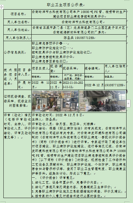 云南昀沣节水科技有限公司年产10000吨pe管、微喷带的生产建设项目职业病危害控制效果评价