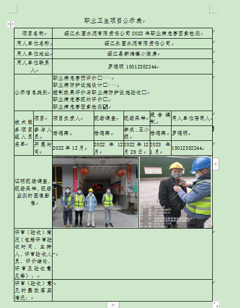 绥江永固水泥有限责任公司2022年职业病危害因素检测