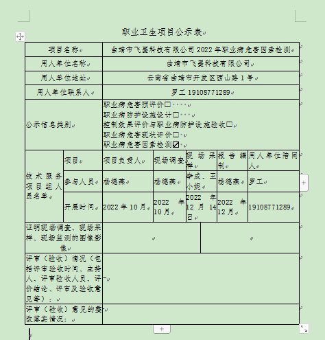 曲靖市飞墨科技有限公司2022年职业病危害因素检测-尊龙登录