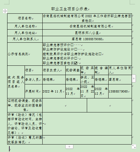 云南昆船机械制造有限公司2022年工作场所职业病危害因素检测