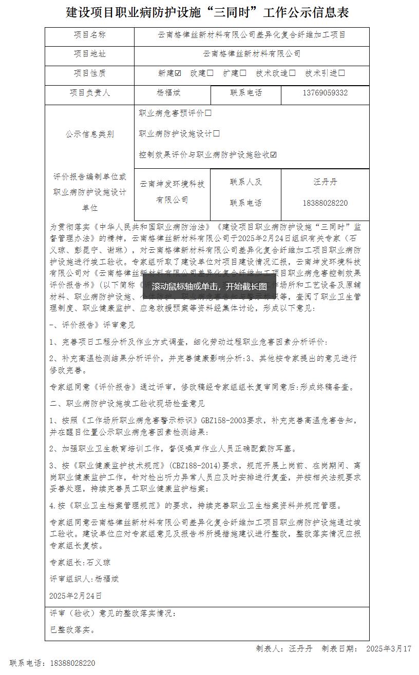 云南格律丝新材料有限公司差异化复合纤维加工项目职业病危害控制效果评价