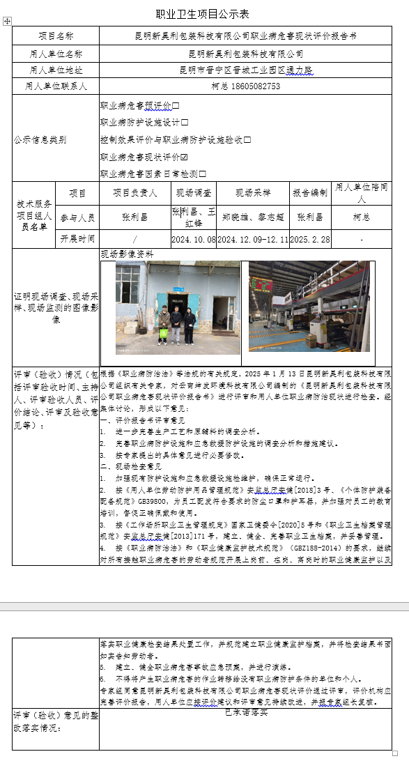昆明新昊利包装科技有限公司职业病危害现状评价报告书