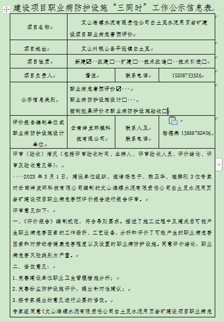文山海螺水泥有限责任公司白土觅水泥用页岩矿建设项目职业病危害预评价