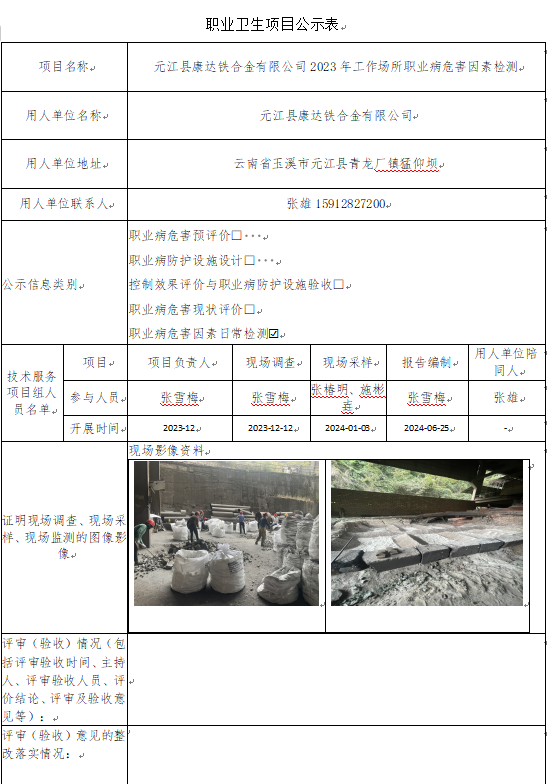 元江县康达铁合金有限公司2023年工作场所职业病危害因素检测
