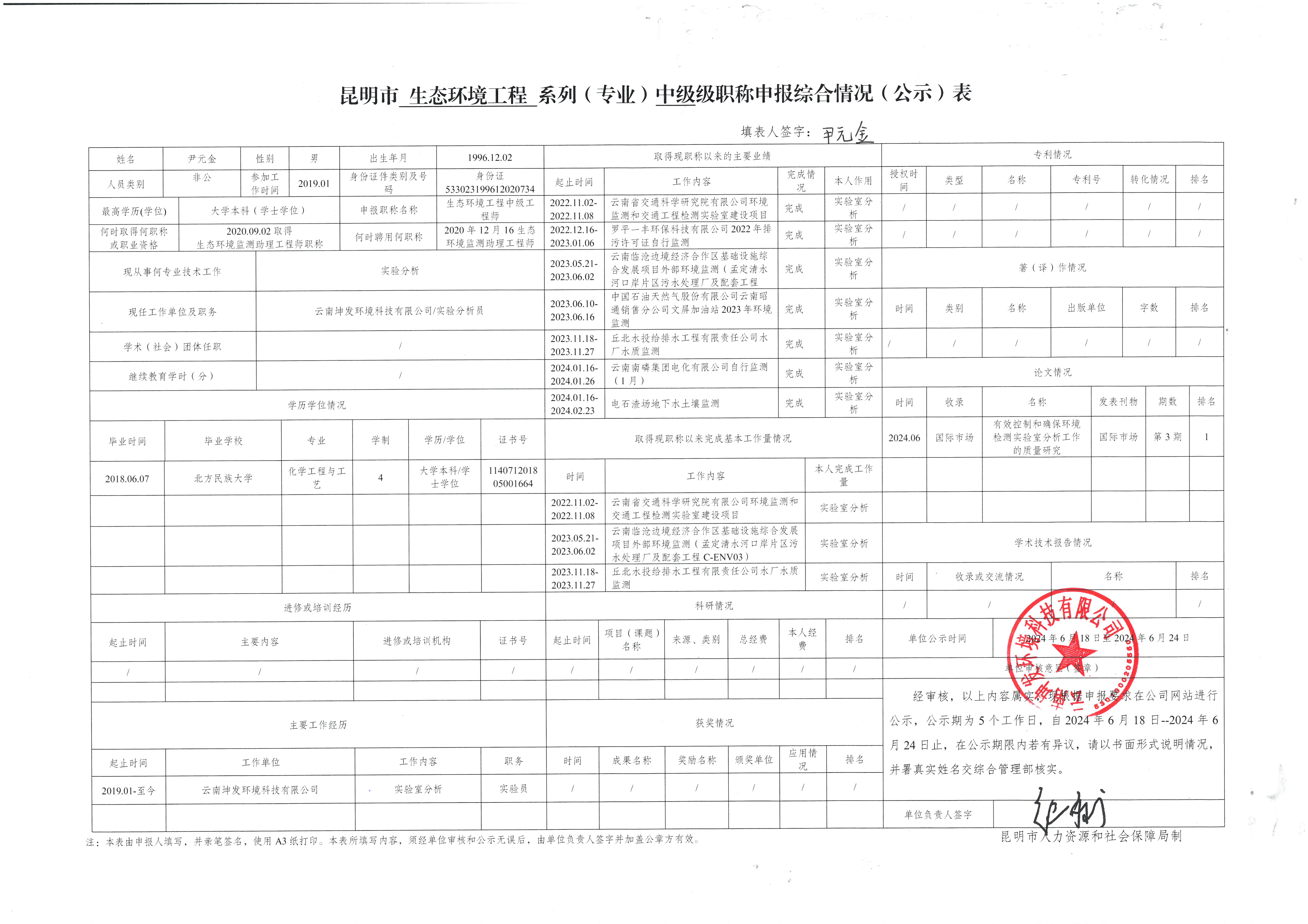云南坤发环境科技有限公司关于尹元金同志申报2024年生态环境监测与分析工程师的公示 根据《昆明市生态环境局关于2024年度生态环境工程中级职称申报评审工作通知》(昆生环通【2024】11号文件)内容,我公司经过严格的评审和筛选,尹元金同志已达到申报要求,同意推荐该同志申报生态环境监测与分析工程师职称。现将该同志基本情况在公司网站进行5个工作日的公示,公示期自2024年6月18日-2024年6月24日止,在公示期限内若有异议,请以书面形式说明情况,并署真实姓名交综合管理部核实。