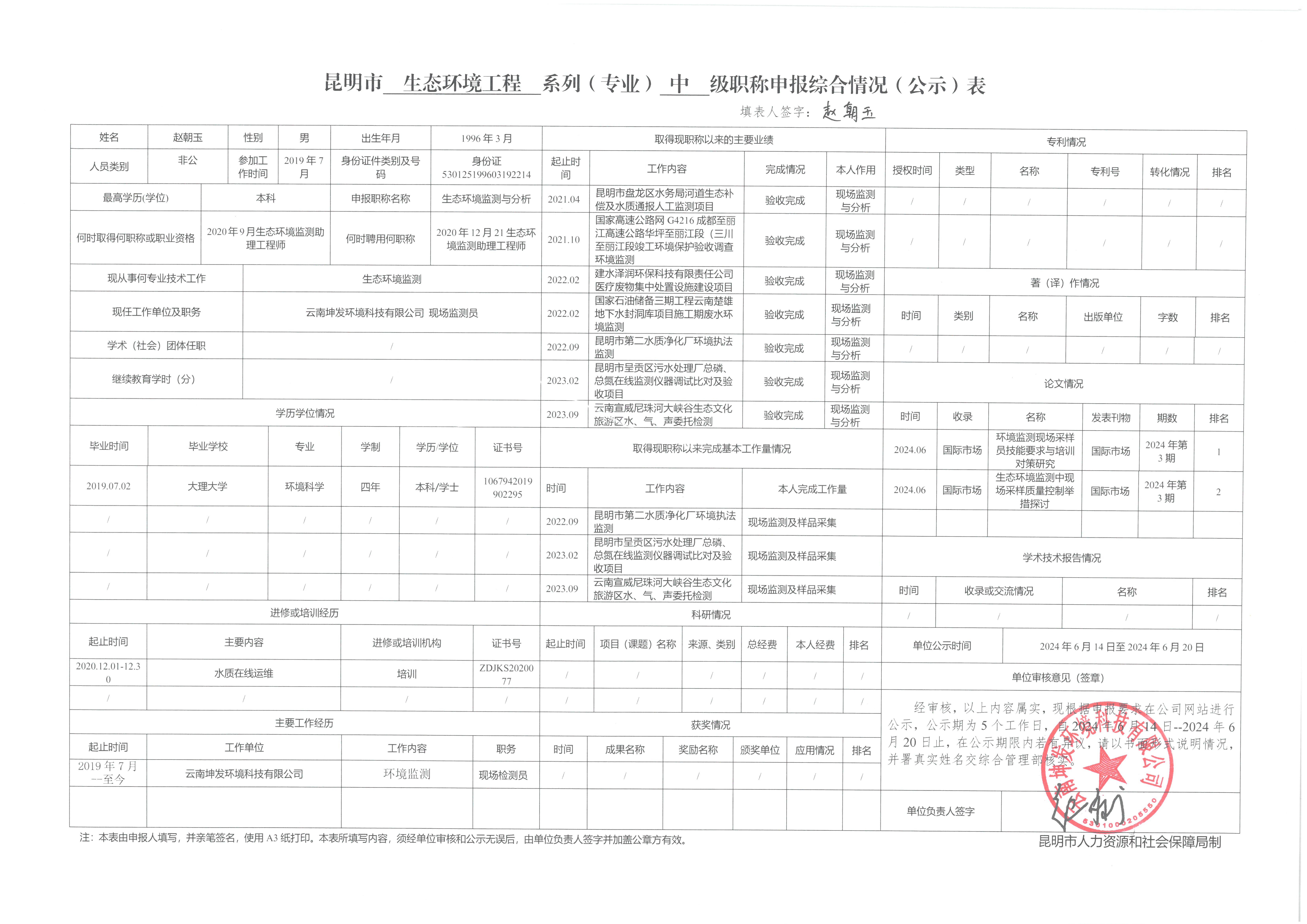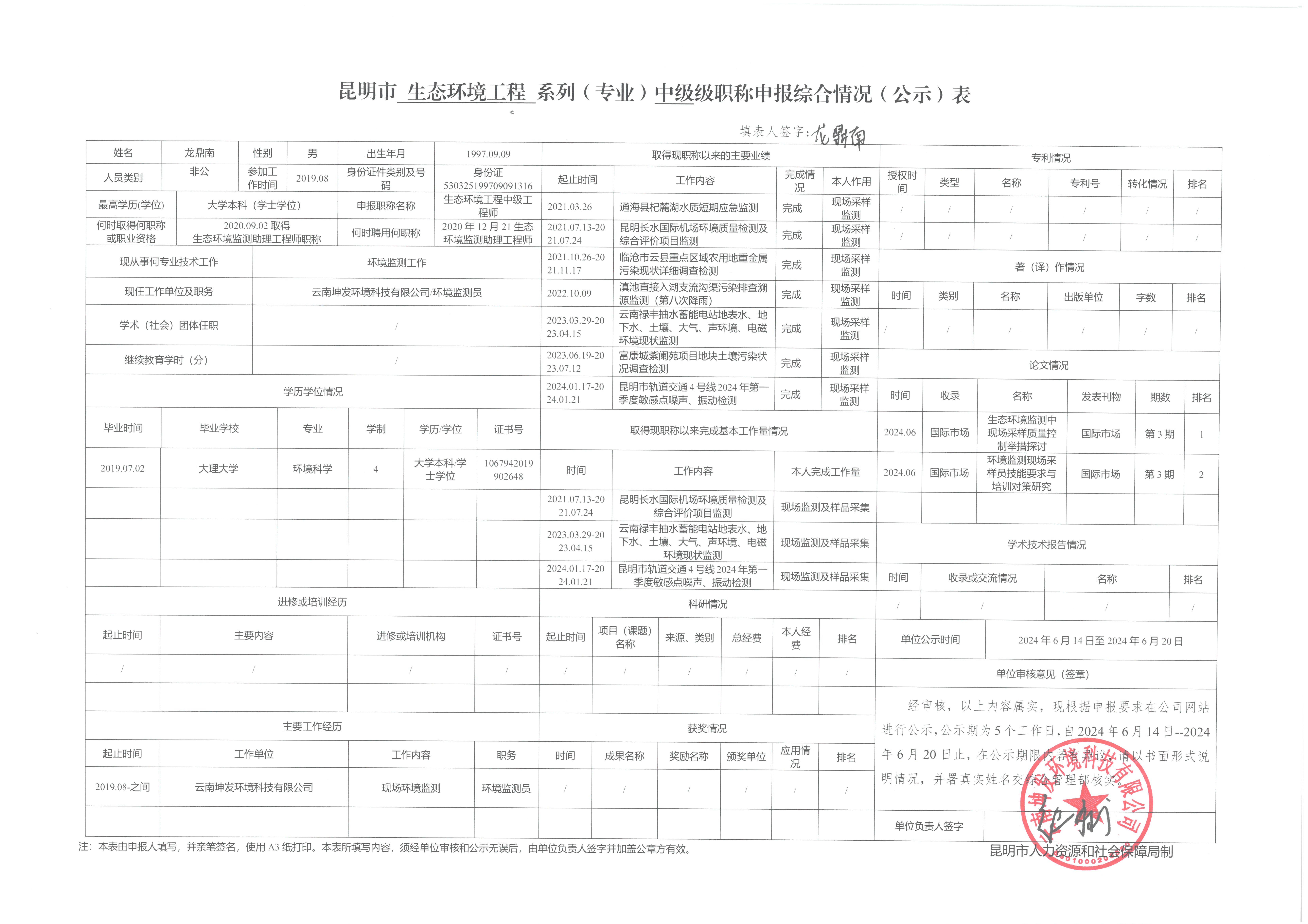 云南坤发环境科技有限公司 关于龙鼎南、张敬一、赵朝玉同志申报2024年生态环境监测与分析工程师的公示