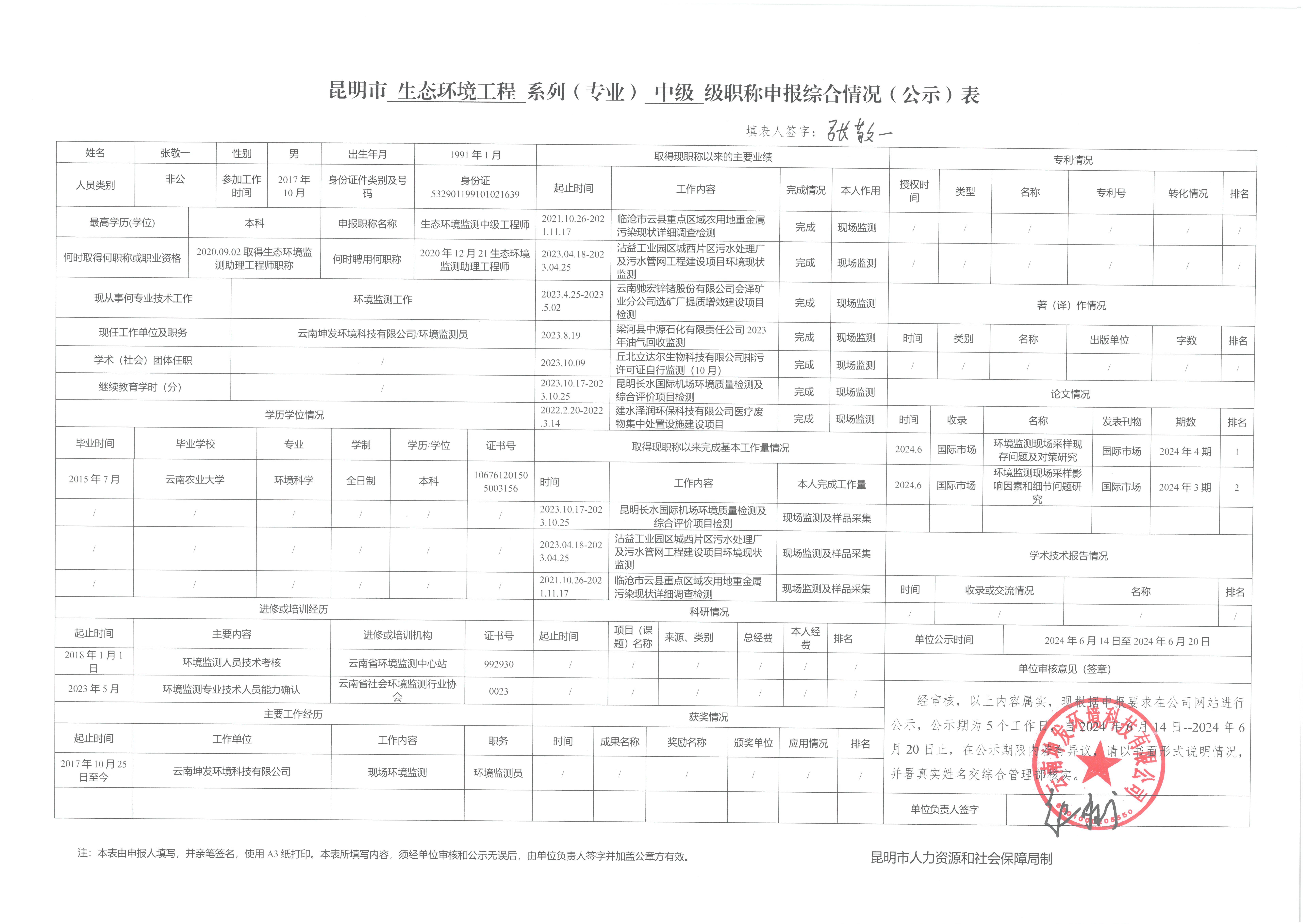 根据《昆明市生态环境局关于2024年度生态环境工程中级职称申报评审工作通知》(昆生环通【2024】11号文件)内容,我公司经过严格的评审和筛选,张敬一、赵朝玉、龙鼎南三位同志均已达到申报要求,同意推荐该三位同志申报生态环境监测与分析工程师职称。现将三位同志基本情况在公司网站进行5个工作日的公示,公示期自2024年6月14日-2024年6月20日止,在公示期限内若有异议,请以书面形式说明情况,并署真实姓名交综合管理部核实。