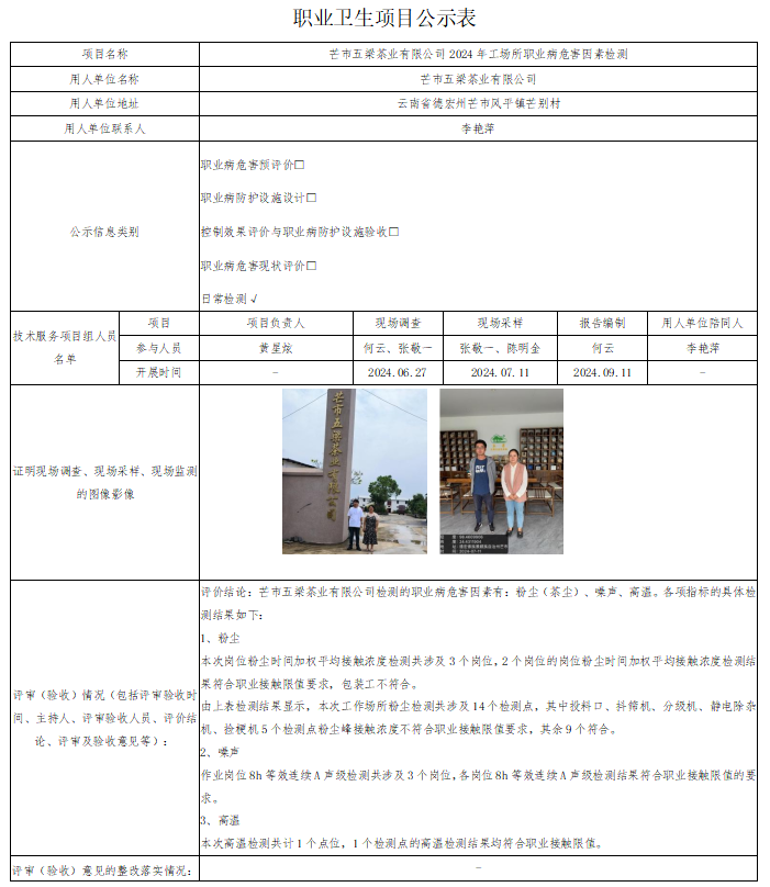 芒市五梁茶业有限公司2024年工场所职业病危害因素检测