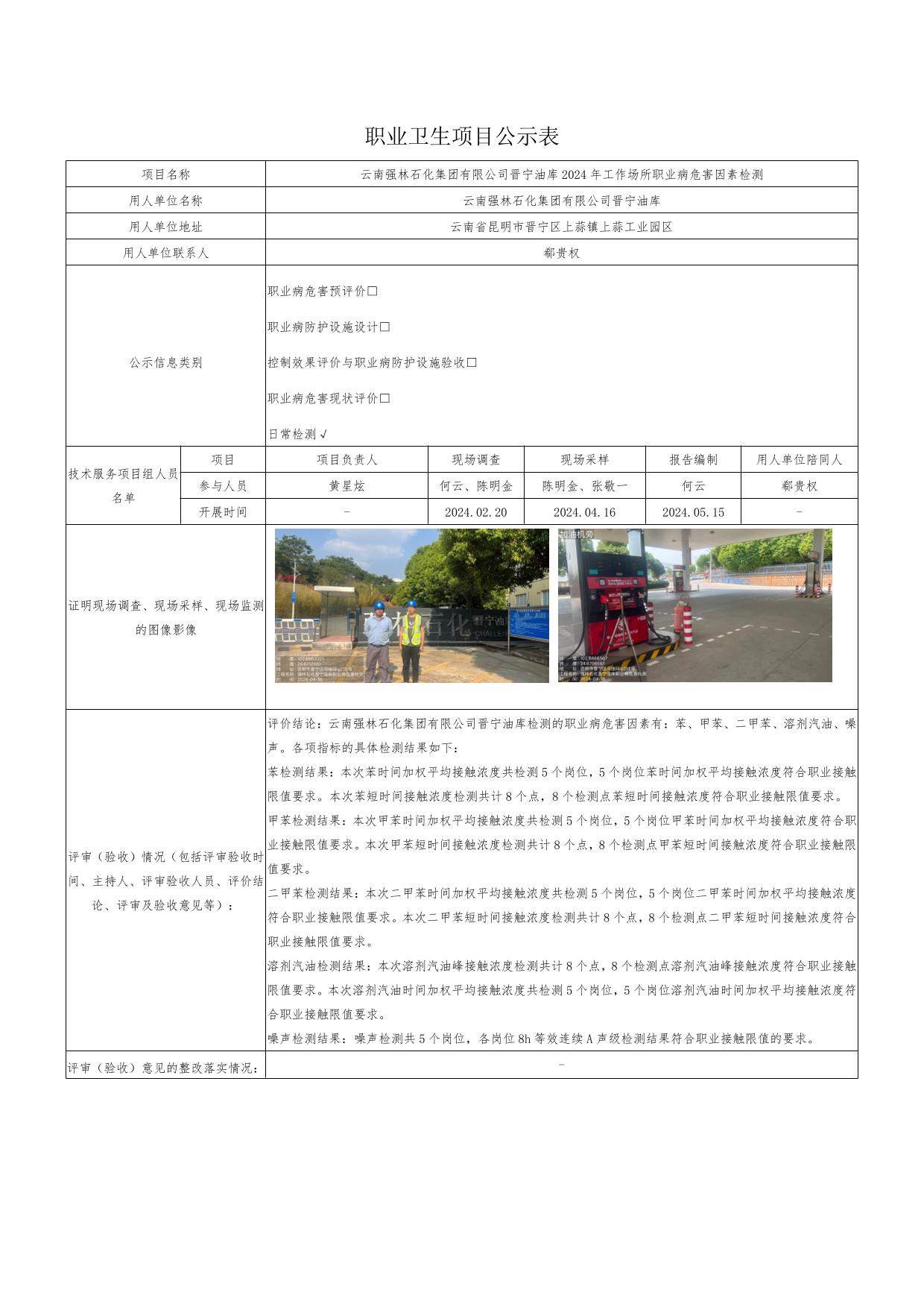 云南强林石化集团有限公司晋宁油库2024年工作场所职业病危害因素检测