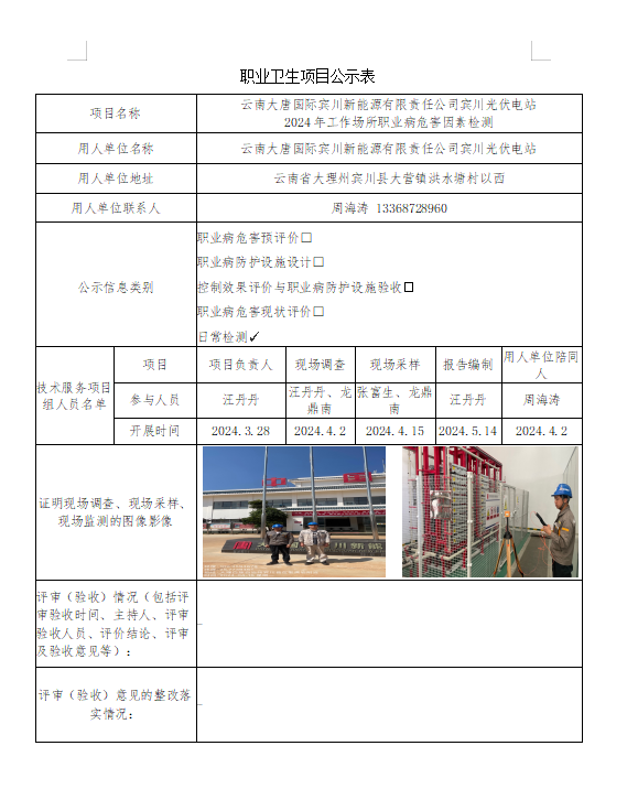 云南大唐国际宾川新能源有限责任公司宾川光伏电站 2024年工作场所职业病危害因素检测