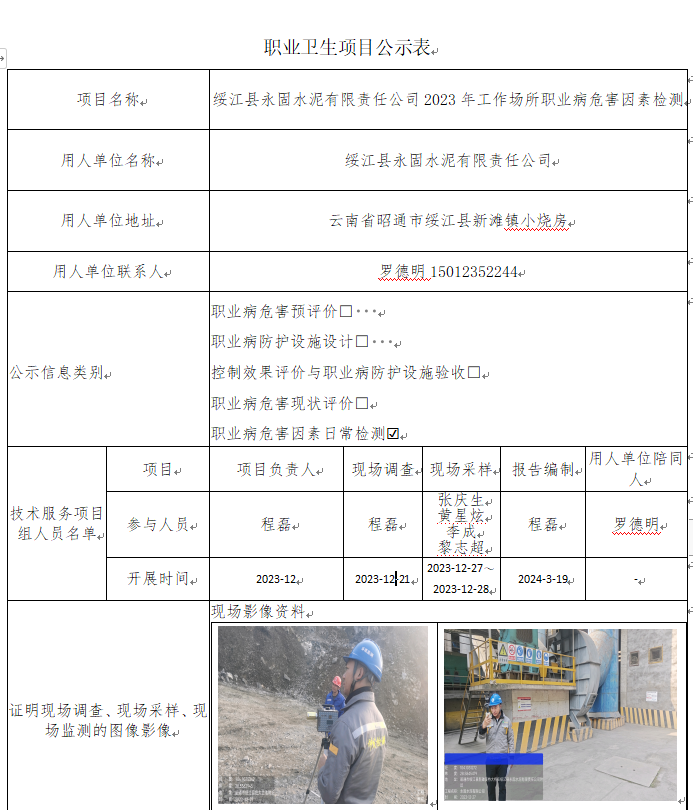 绥江县永固水泥有限责任公司2023年工作场所职业病危害因素检测