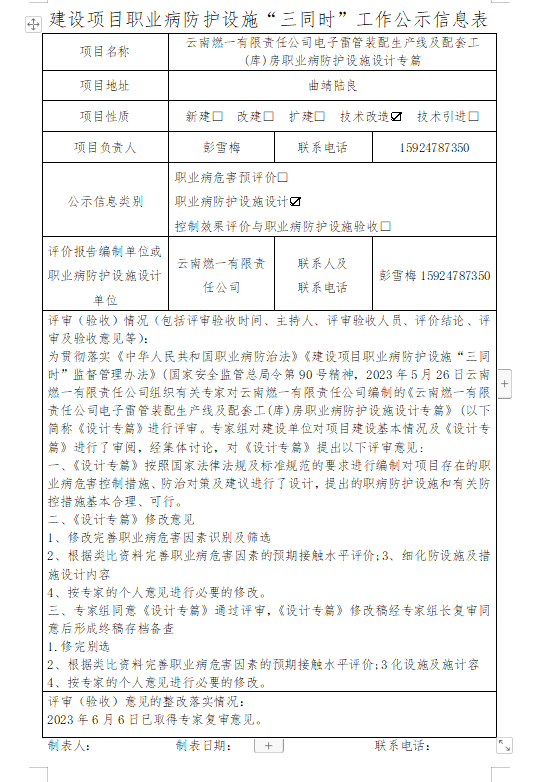 云南燃一有限责任公司电子雷管装配生产线及配套工(库)房职业病防护设施设计专篇