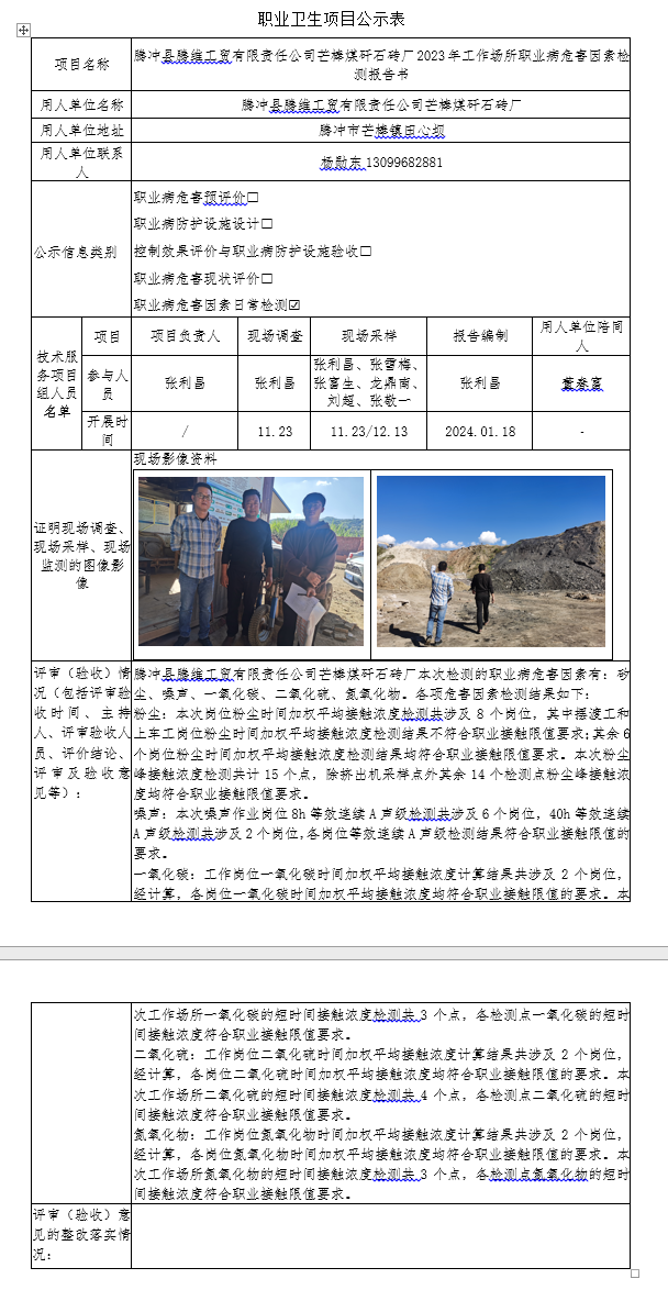 腾冲县腾维工贸有限责任公司芒棒煤矸石砖厂2023年工作场所职业病危害因素检测报告书