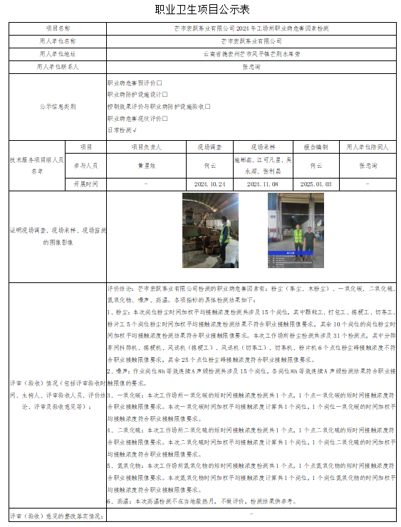 芒市宏跃茶业有限公司2024年工作场所职业病危害因素检测
