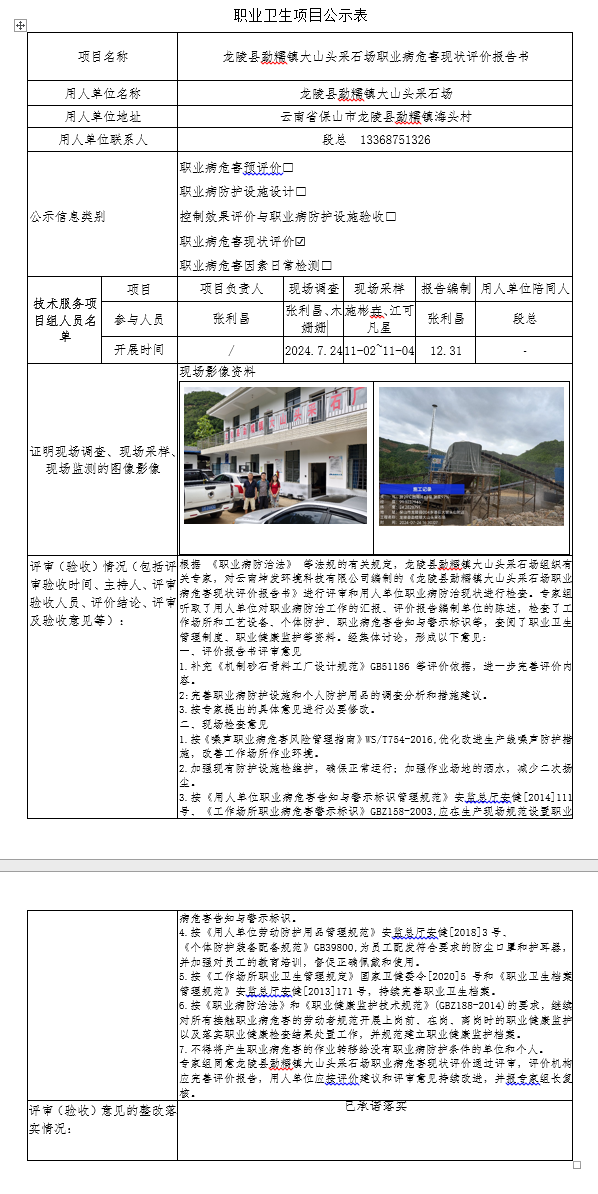 龙陵县勐糯镇大山头采石场职业病危害现状评价报告书