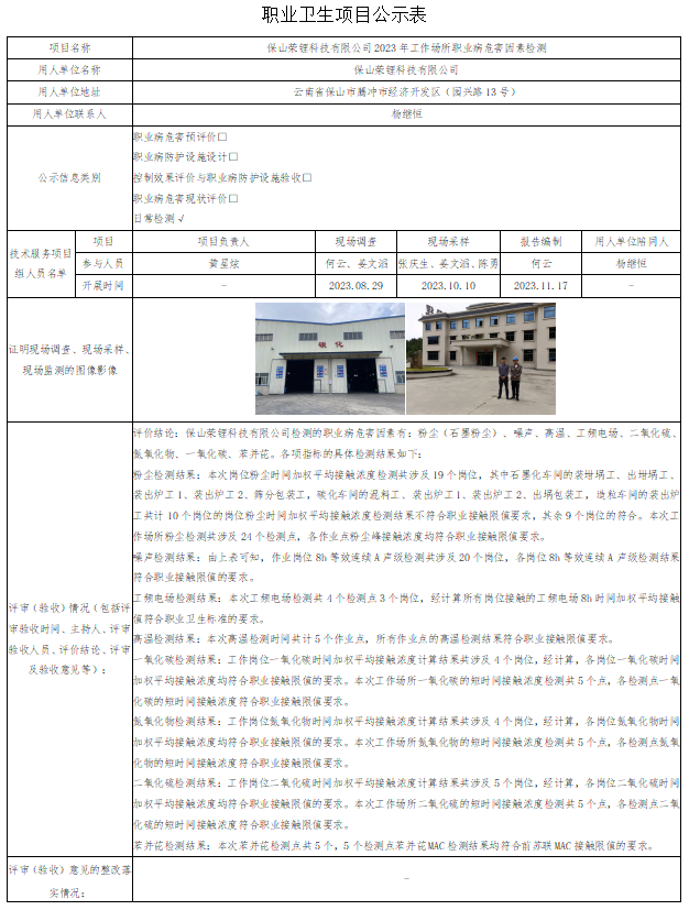 保山荣锂科技有限公司2023年工作场所职业病危害因素检测
