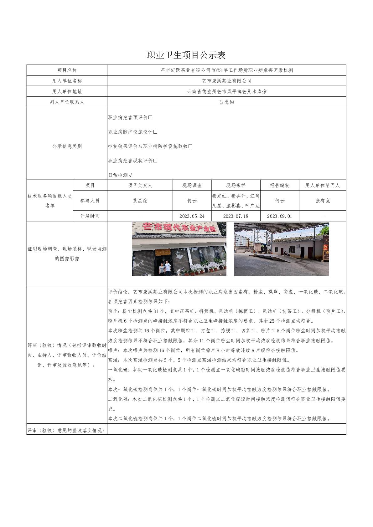 芒市宏跃茶业有限公司2023年工作场所职业病危害因素检测