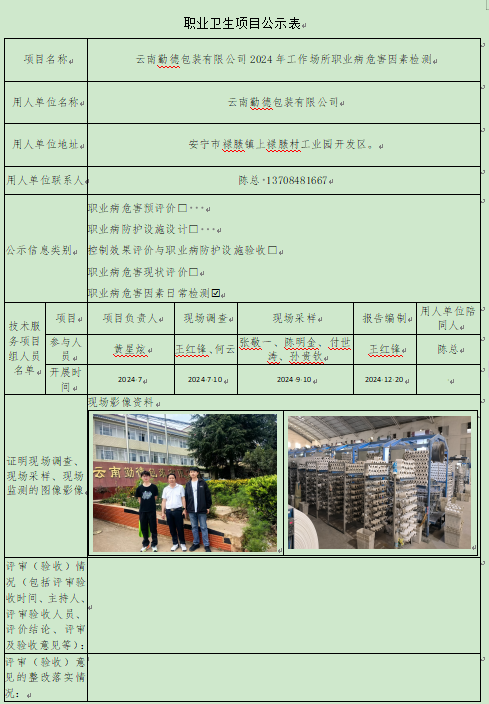 云南勤德包装有限公司2024年工作场所职业病危害因素检测