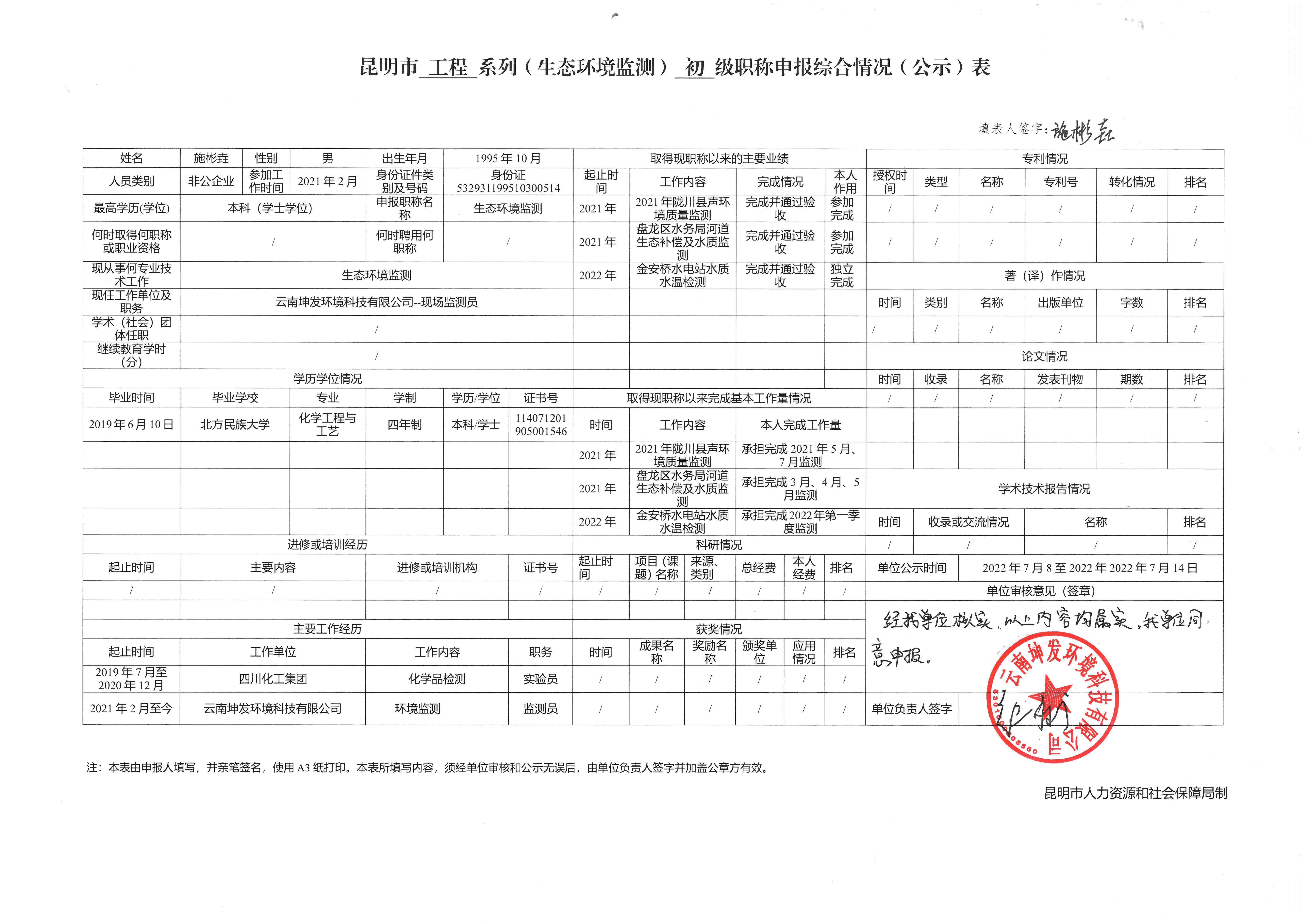 根据《昆明市人力资源和社会保障局关于开展2022年专业技术职称申报评审工作的通知》要求,现将云南坤发环境科技有限公司生态环境监测初级职称申报人员信息公示如下: