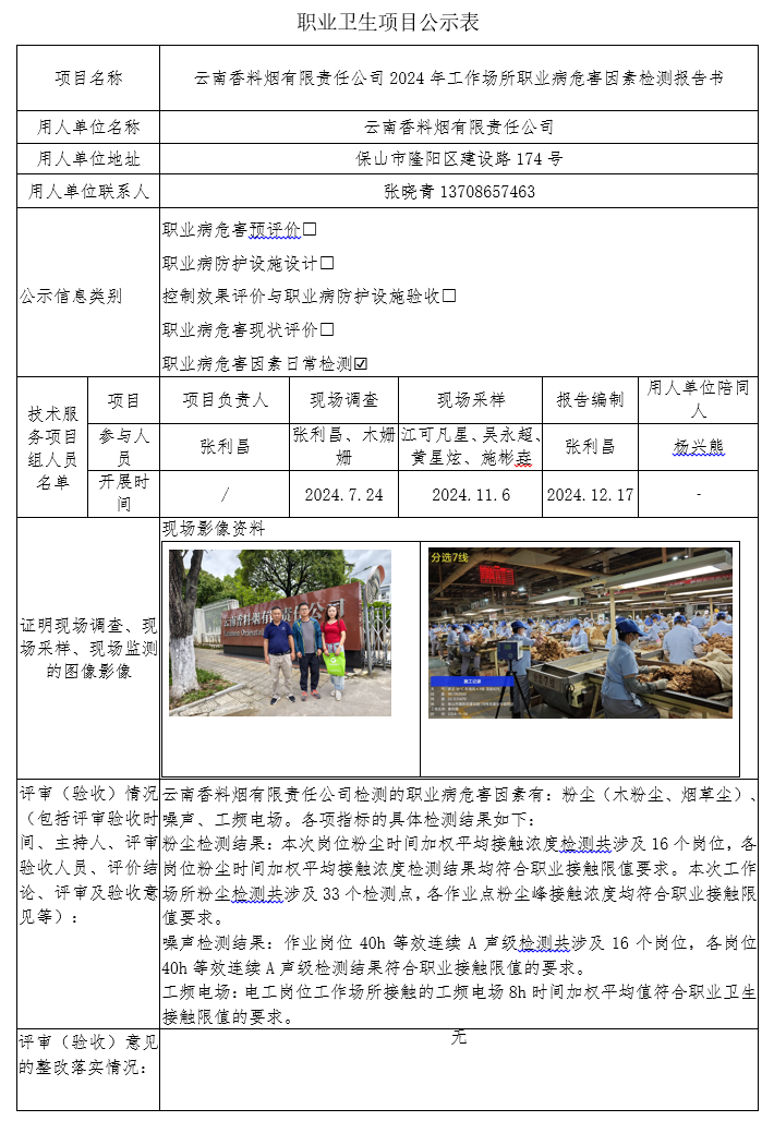 云南香料烟有限责任公司2024年工作场所职业病危害因素检测报告书