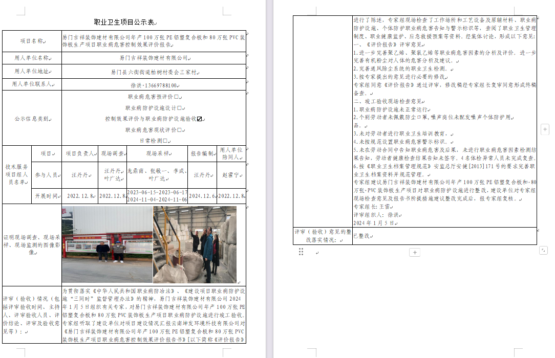 易门吉祥装饰建材有限公司年产100万张pe铝塑复合板和80万张pvc装饰板生产项目职业病危害控制效果评价报告