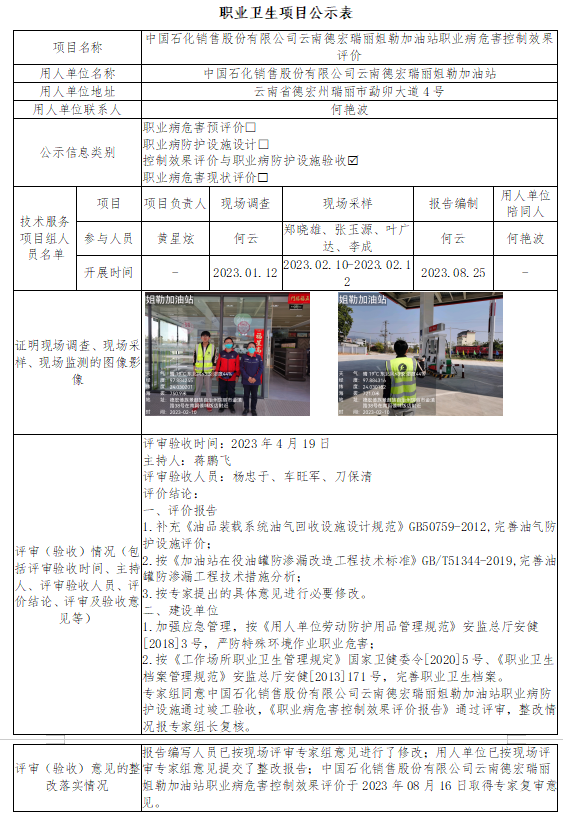 中国石化销售股份有限公司云南德宏瑞丽姐勒加油站职业病危害控制效果评价
