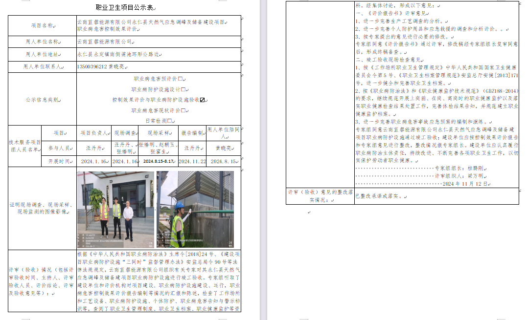 云南苴蓉能源有限公司永仁县天然气应急调峰及储备建设项目 职业病危害控制效果评价