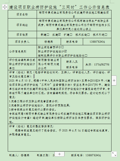 瑞丽市景成硅业有限责任公司改建环保设施工程建设项目职业病防护设施设计专篇