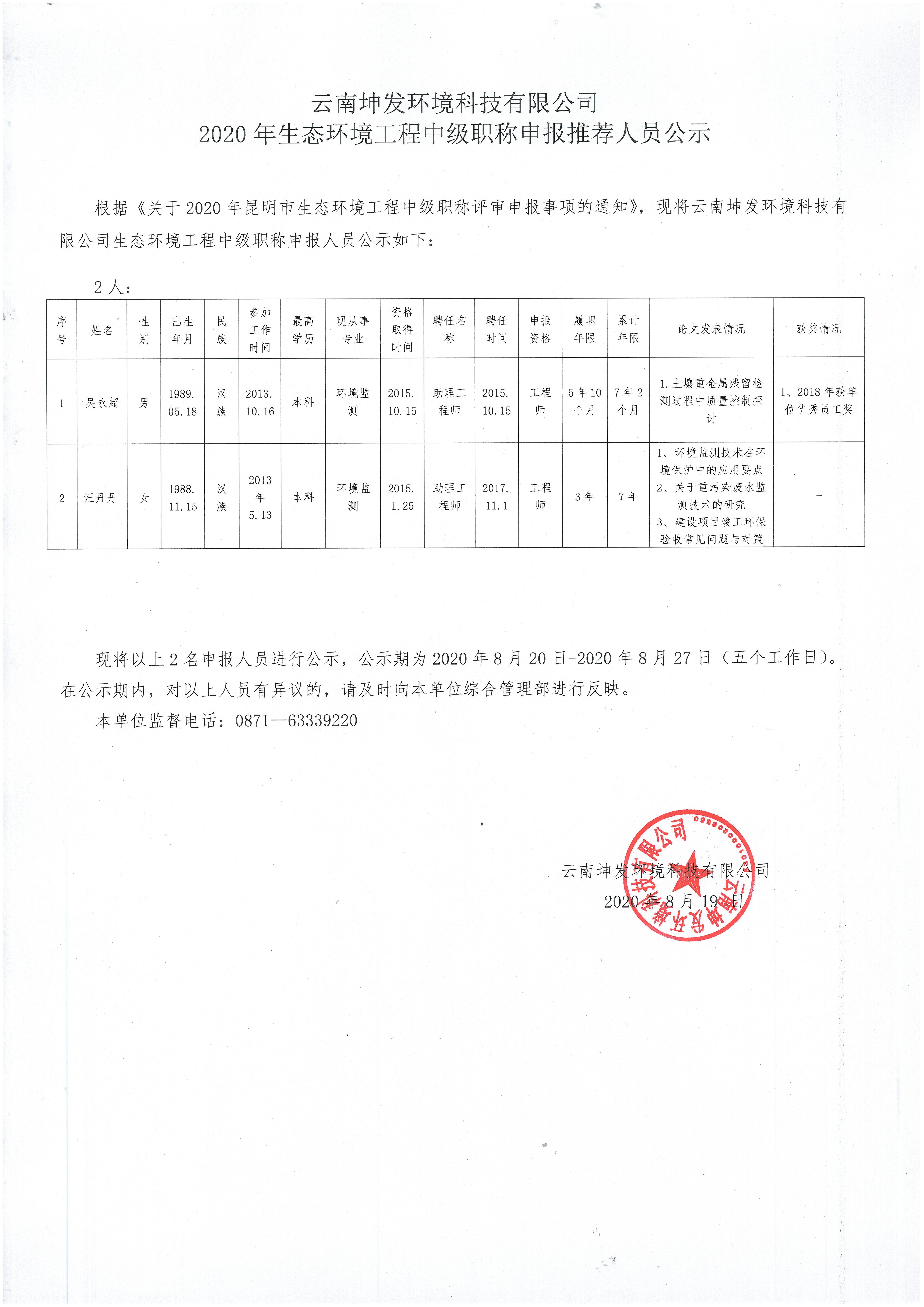 根据《关于2020年昆明市生态环境工程中级职称评审申报事项的通知》,现将云南坤发环境科技有限公司生态环境工程中级职称申报人员公示如下: