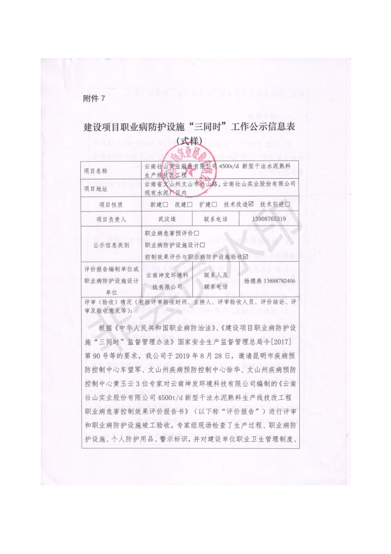 云南壮山实业股份有限公司 4500t/d新型干法水泥熟料生产线技改工程职业病危害控制效果评价