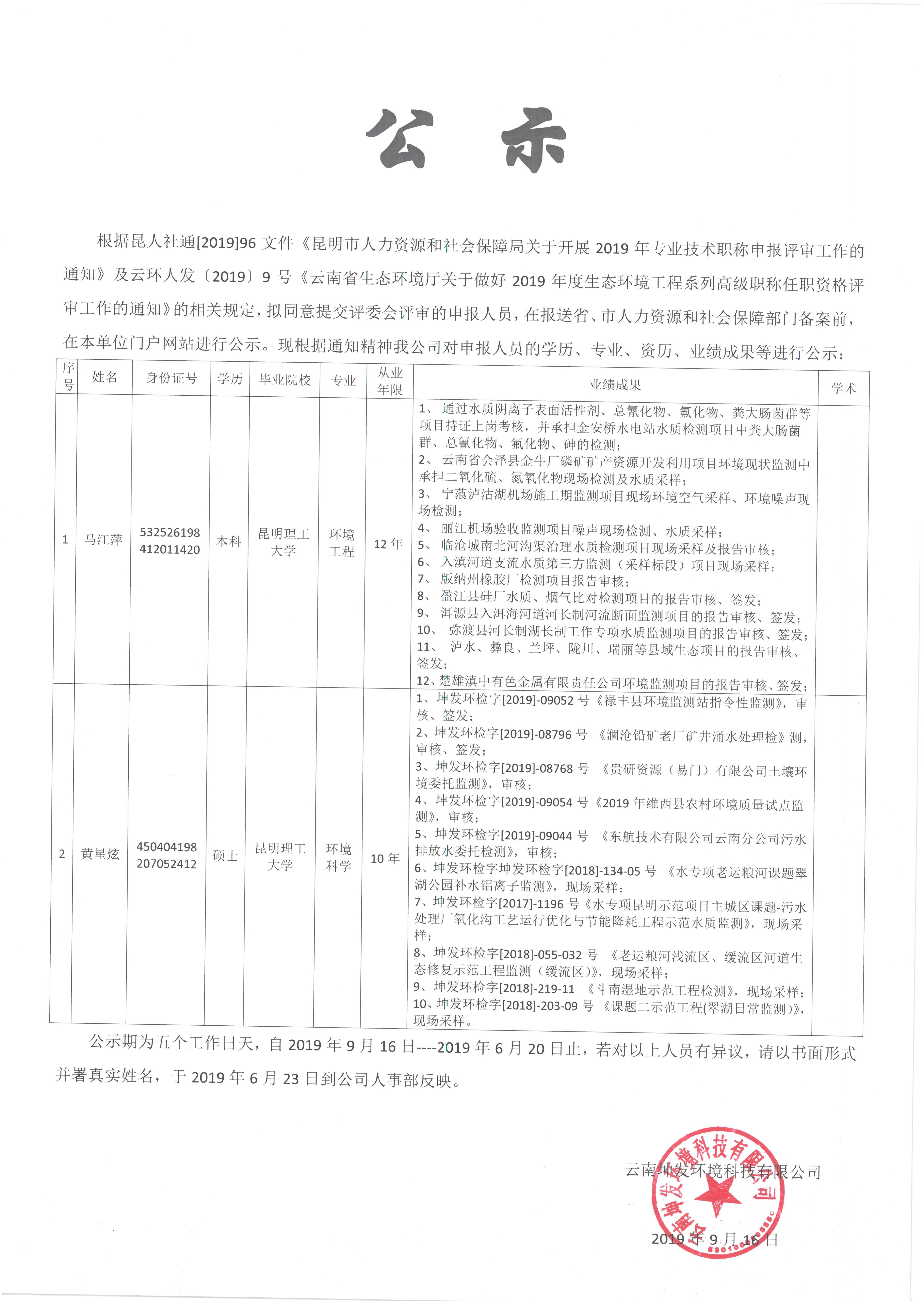 根据昆人社通[2019]96文件《昆明市人力资源和社会保障局关于开展2019年专业技术职称申报评审工作的通知》及云环人发〔2019〕9号《云南省生态环境厅关于做好2019年度生态环境工程系列高级职称任职资格评审工作的通知》的相关规定,拟同意提交评委会评审的申报人员,在报送省、市人力资源和社会保障部门备案前,在本单位门户网站进行公示。现根据通知精神我公司对申报人员的学历、专业、资历、业绩成果等进行公示: