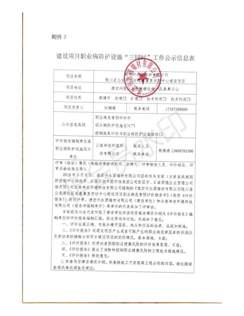 德宏州永固墙材有限公司陇川县公安局社区戒毒康复劳动中心建设项目职业病危害与评价