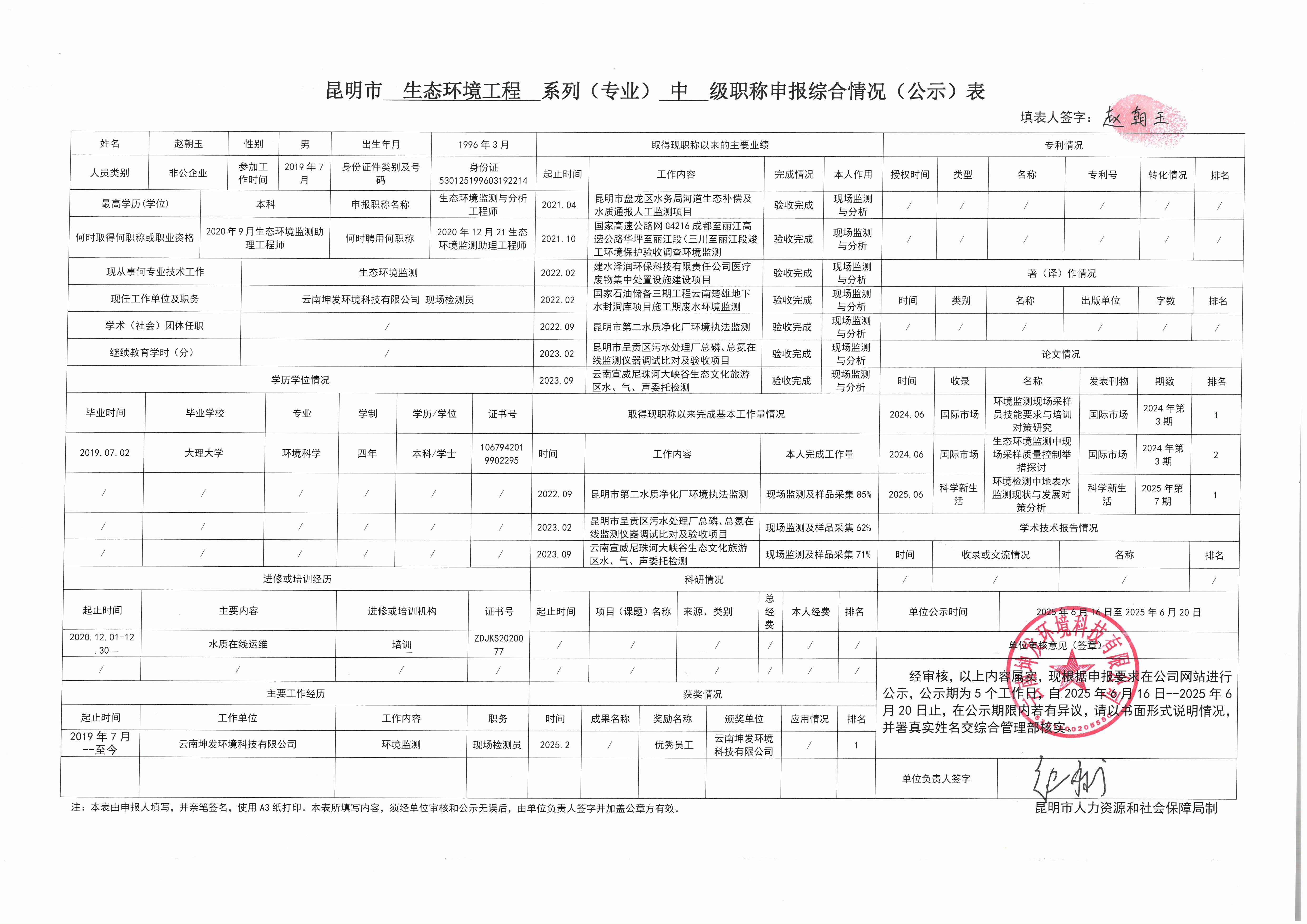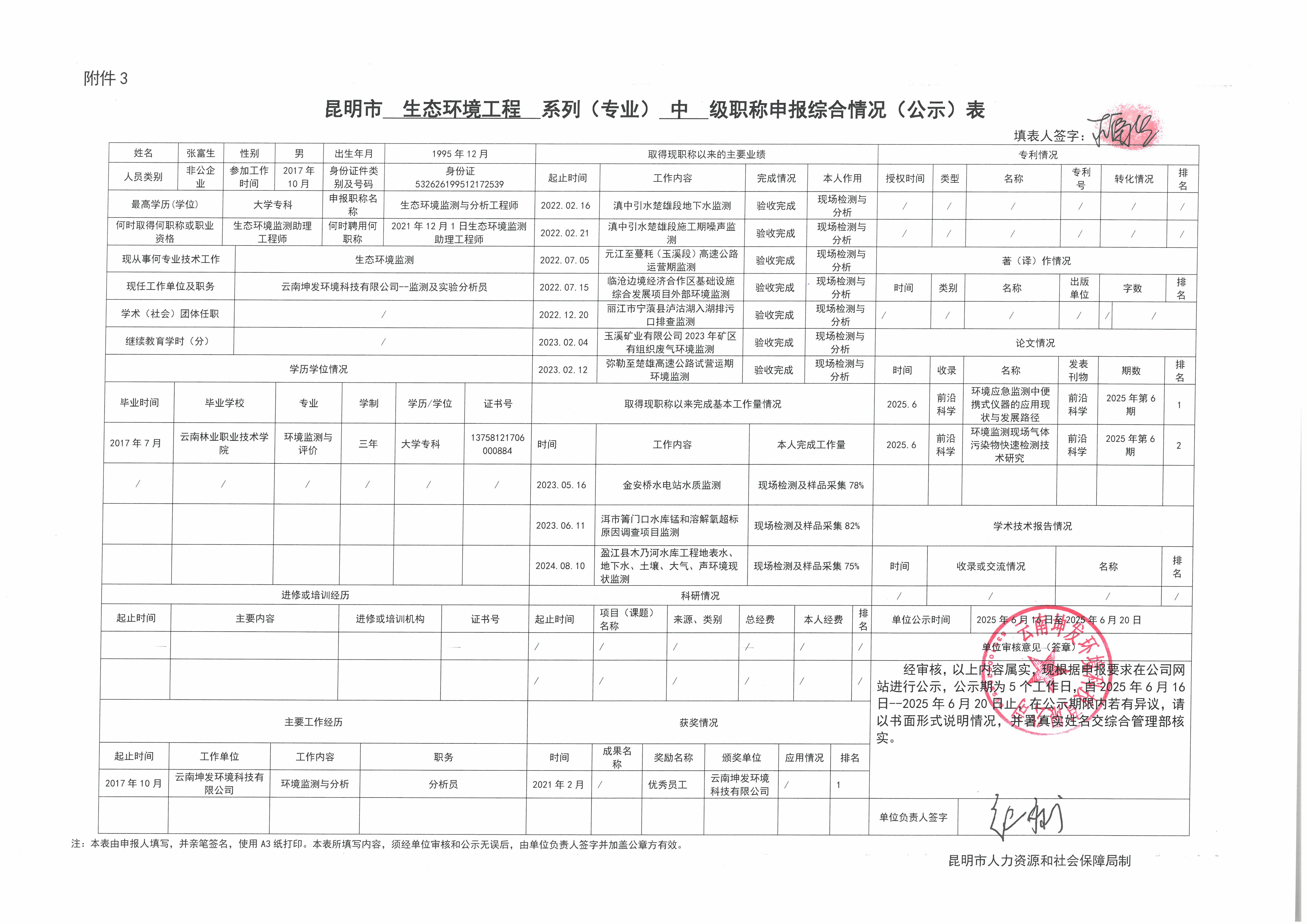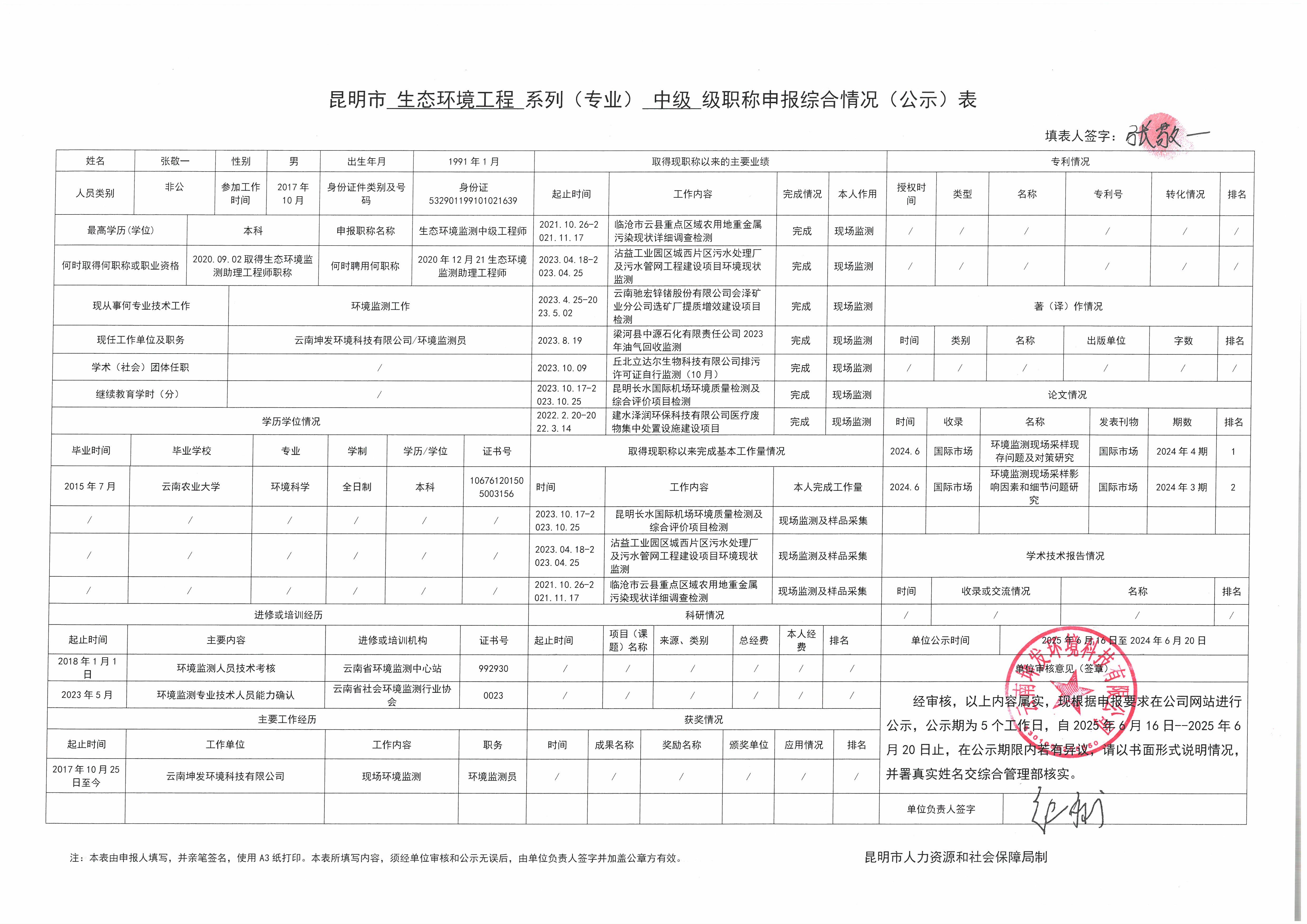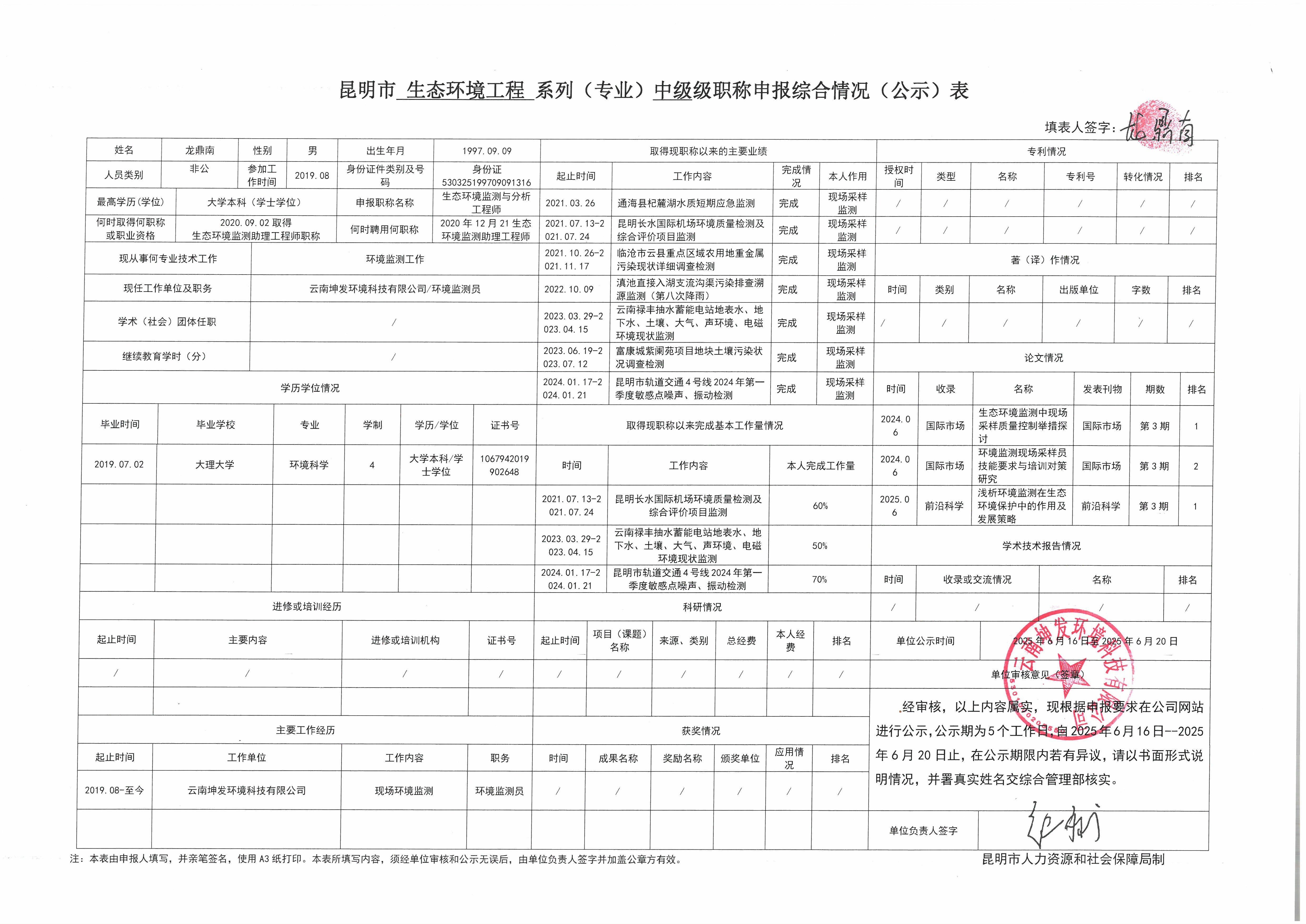 根据《2025年度生态环境工程中级职称申报评审工作的通知》内容,我公司经过严格的评审和筛选,张敬一、赵朝玉、龙鼎南、杨涛、保德云、姜文滔、张富生、李成、刘超同志均已达到评审要求,我公司同意推荐该九位同志申报昆明市生态环境工程工程师职称。现将九位同志基本情况在公司网站进行5个工作日的公示,公示期自2025年6月16日至2025年6月20日,在公示期限内若有异议,请以书面形式说明情况,并署真实姓名交综合管理部核实。
