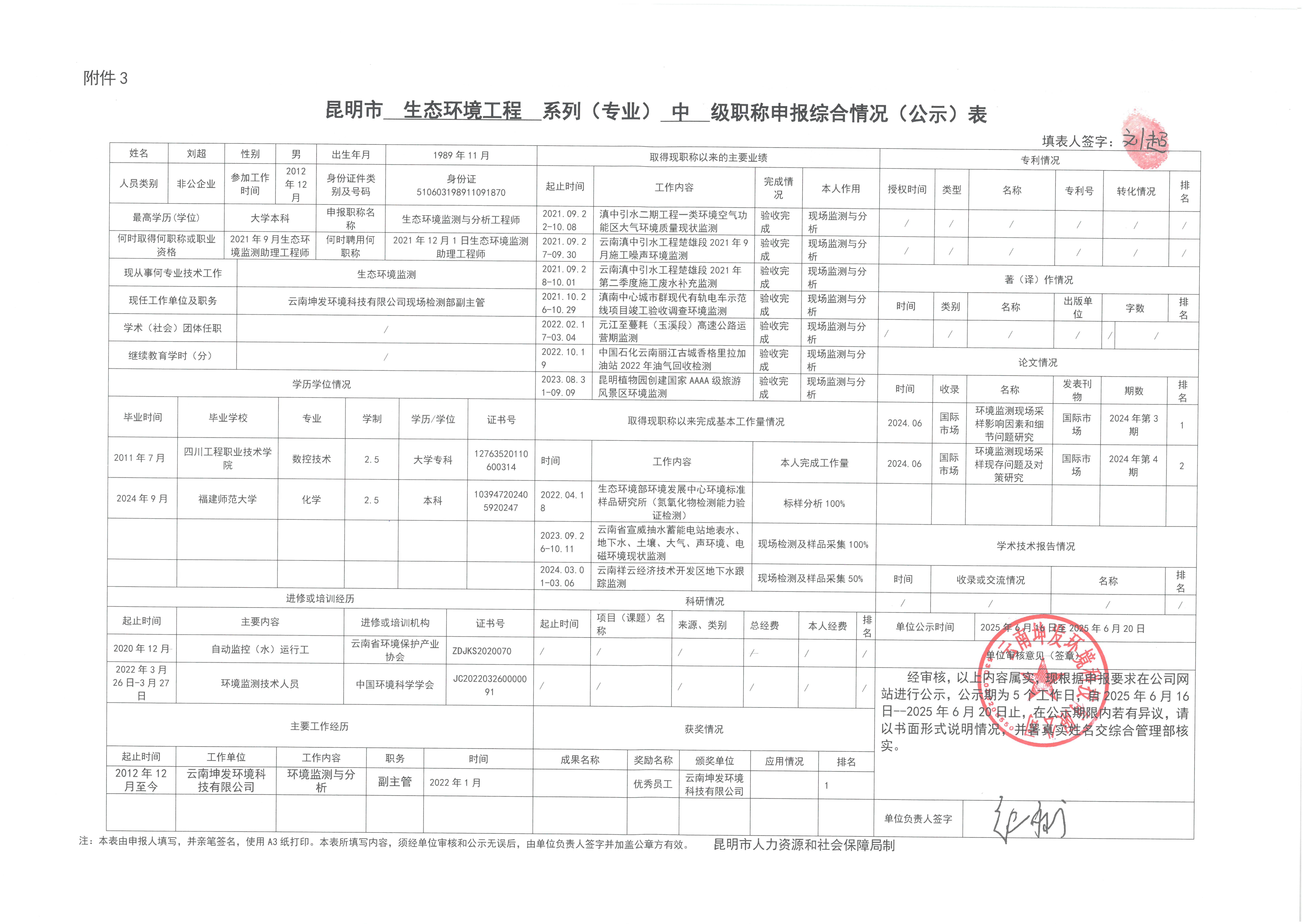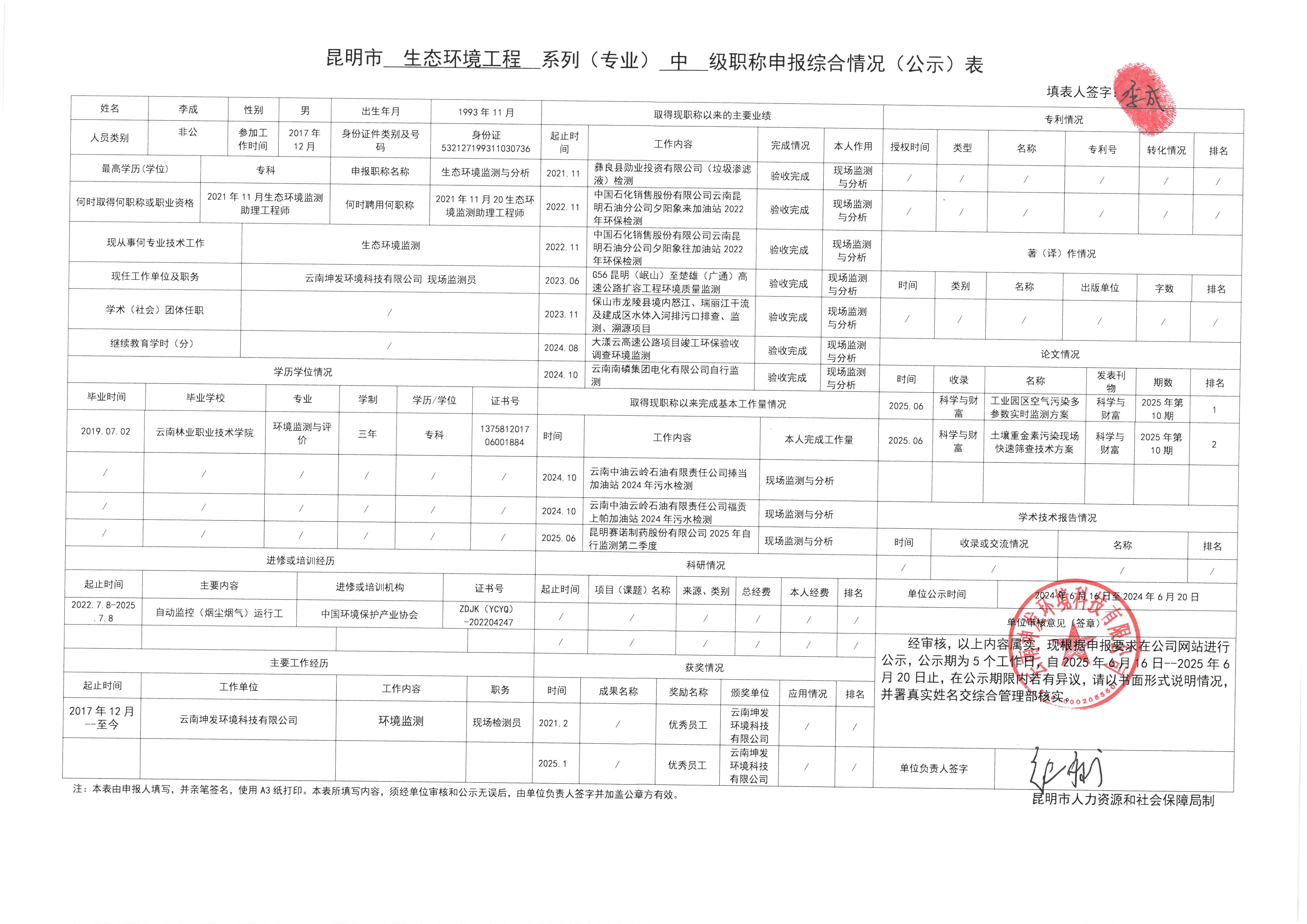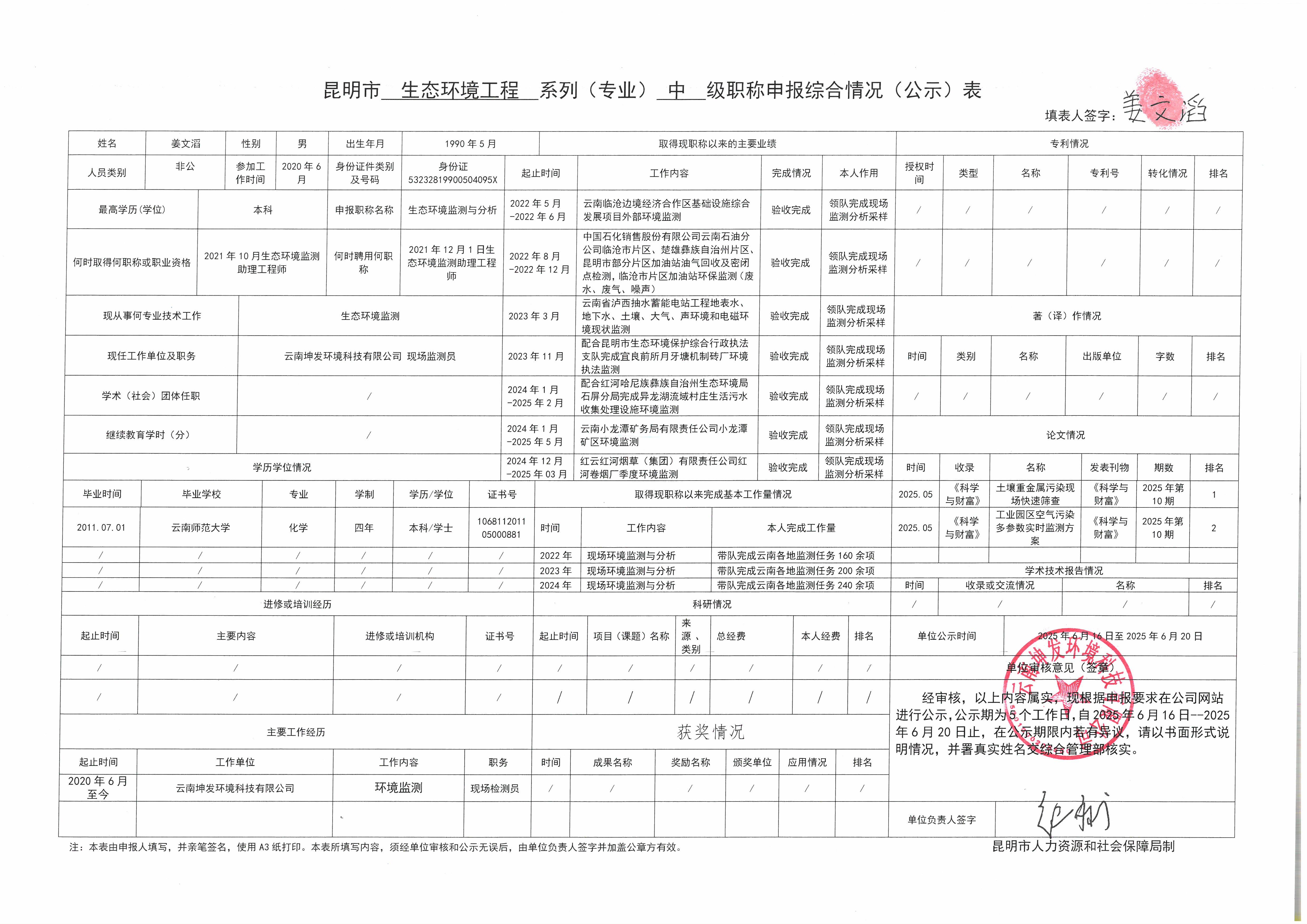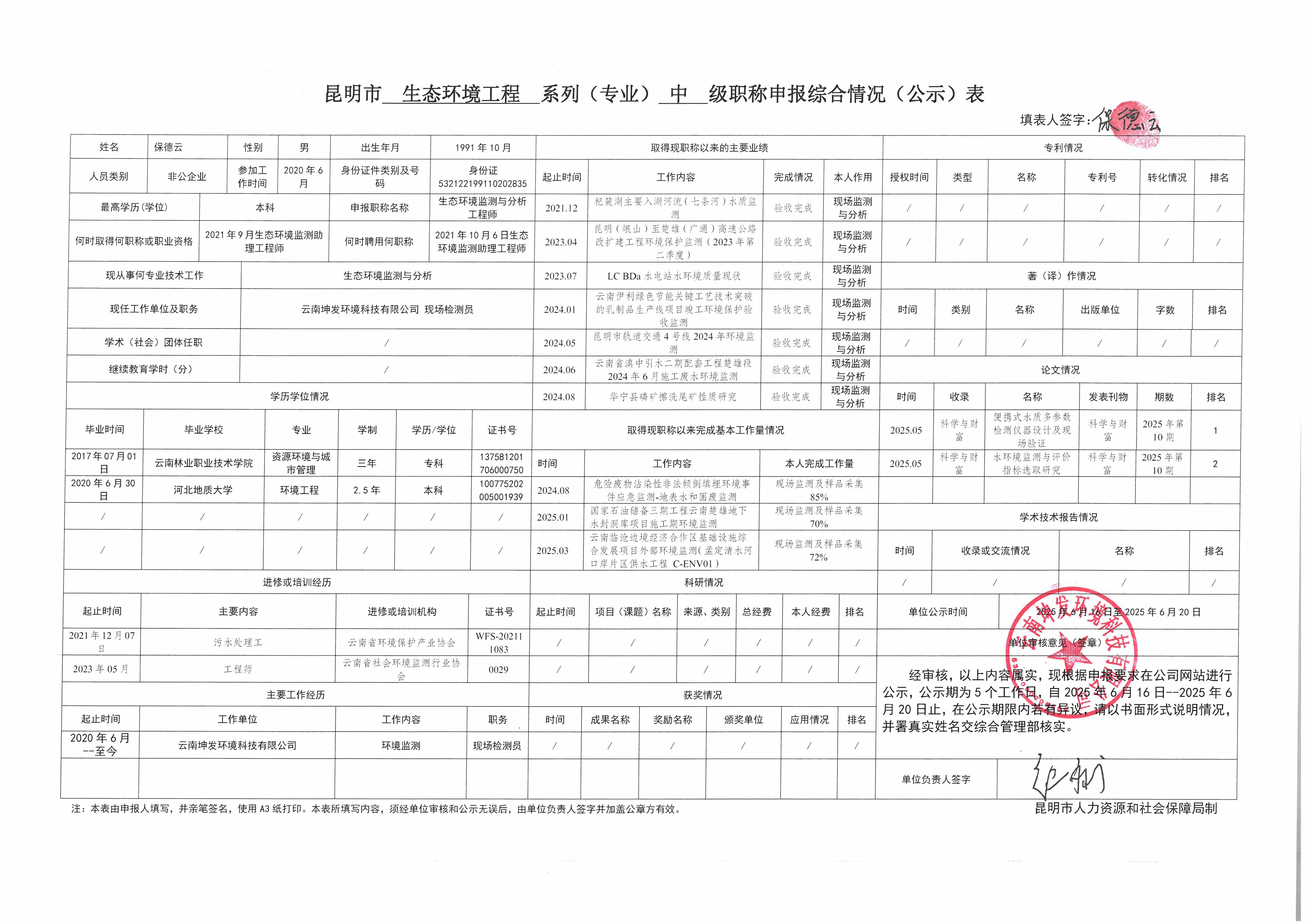 根据《2025年度生态环境工程中级职称申报评审工作的通知》内容,我公司经过严格的评审和筛选,张敬一、赵朝玉、龙鼎南、杨涛、保德云、姜文滔、张富生、李成、刘超同志均已达到评审要求,我公司同意推荐该九位同志申报昆明市生态环境工程工程师职称。现将九位同志基本情况在公司网站进行5个工作日的公示,公示期自2025年6月16日至2025年6月20日,在公示期限内若有异议,请以书面形式说明情况,并署真实姓名交综合管理部核实。
