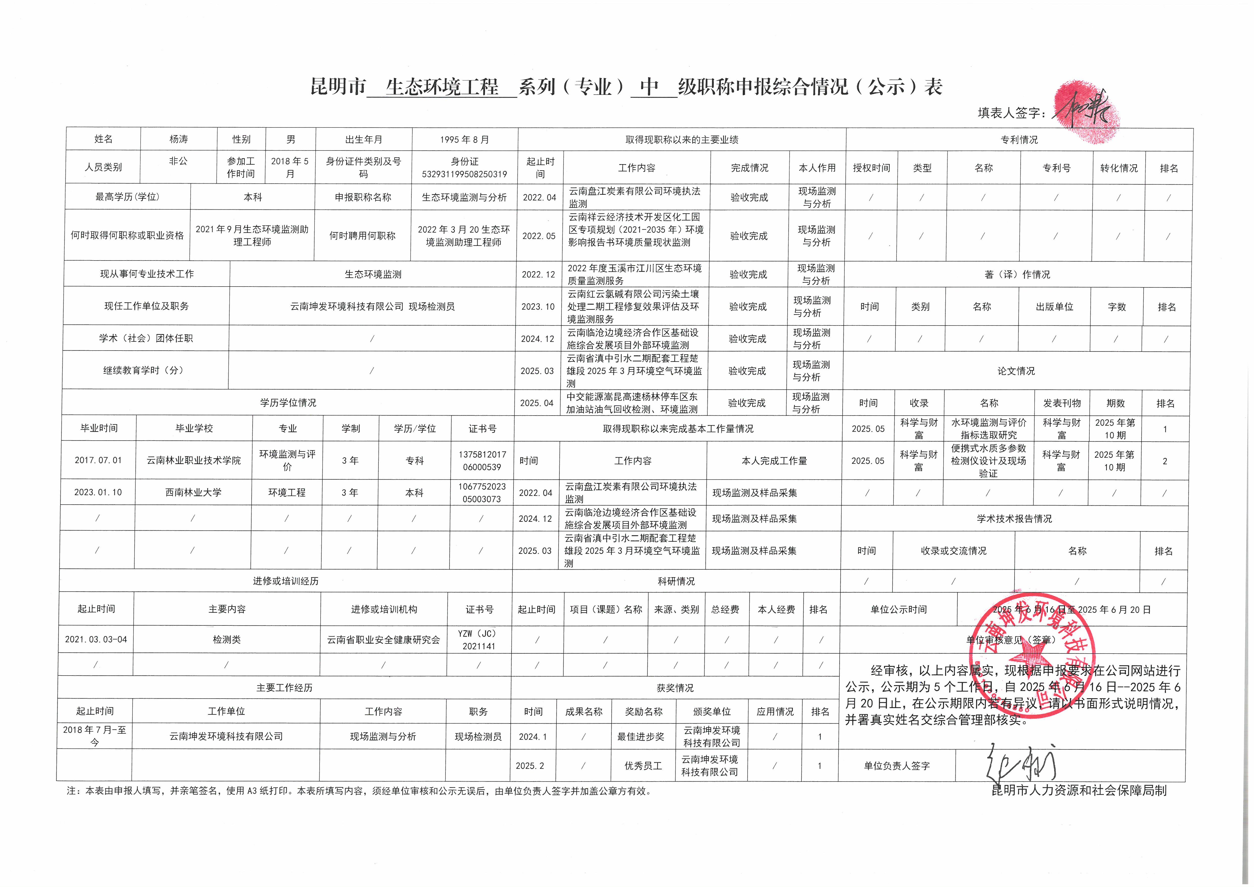 云南坤发环境科技有限公司 关于龙鼎南、张敬一、赵朝玉、杨涛等9位同志申报2025年生态环境工程师的公示